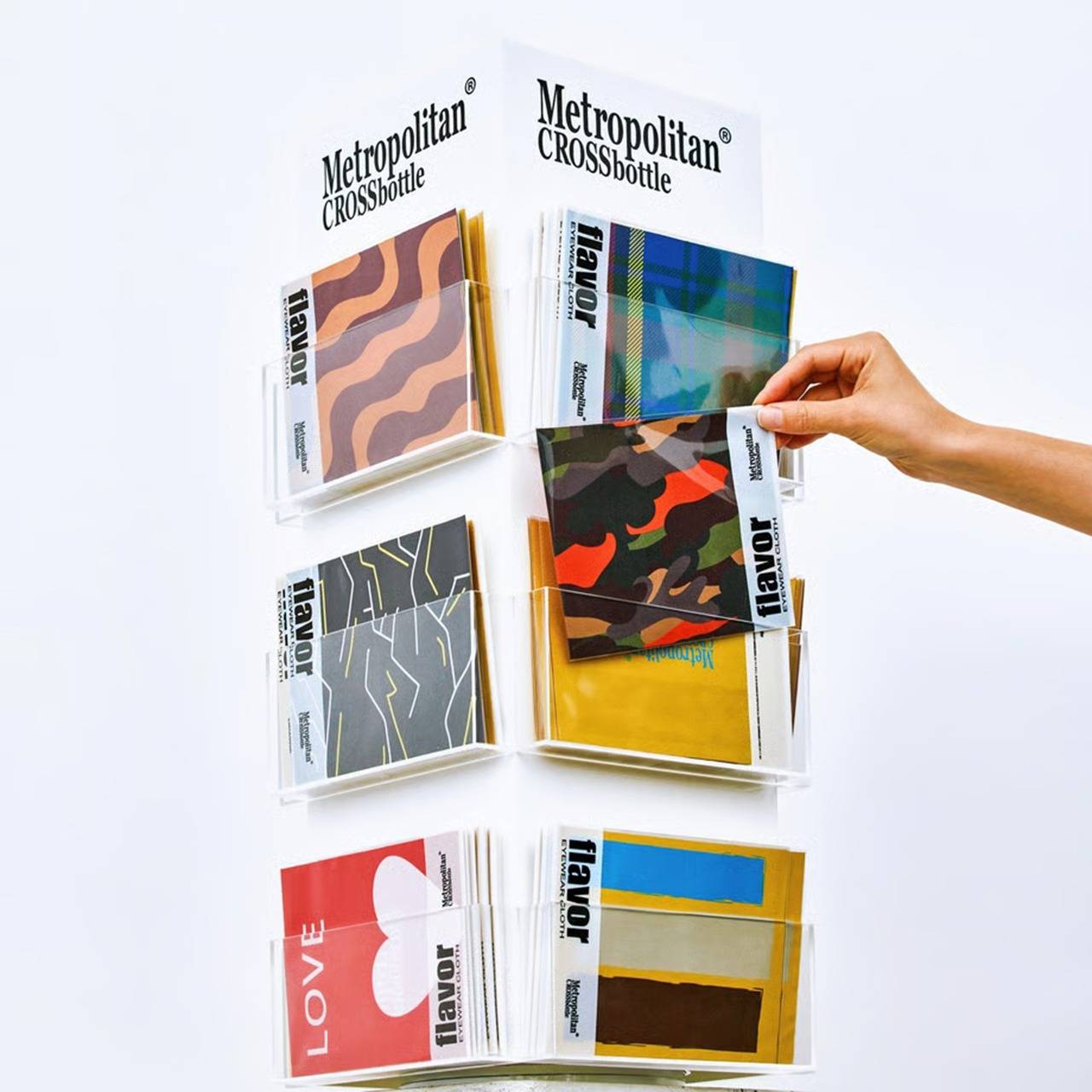 先述のようにサイズ感にもこだわりを持つMetropolitanCROSSbottleだが、ブランドの代名詞といえば、やはりその鮮やかなプリントだろう。特に人気なのは、新進気鋭のアーティストと積極的にコラボレーションし、大判スクエアに大胆なデザインをのせた、アートピースのようなクリーニングクロスである。リッチなプリントが生み出す迫力は、すでに多くのファンを魅了してきた。