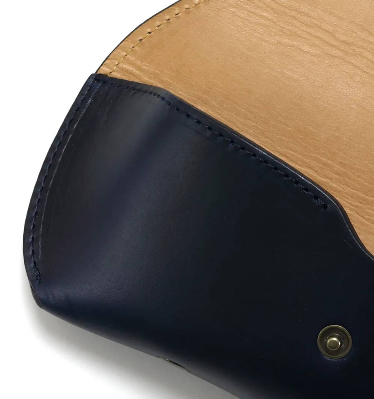 一方、濃いネイビーにキャメルの組み合わせは、都会的でシック。スーツスタイルからカジュアルまで幅広く馴染む。光のない場所では限りなくブラックに見えるほど深い色合いであるが、角度や照明によって、インクのような青みがふっと現れる。使い込むほどに、ブルーブラックで書かれた古い手紙のような抜群の雰囲気を醸し出すのではないだろうか。