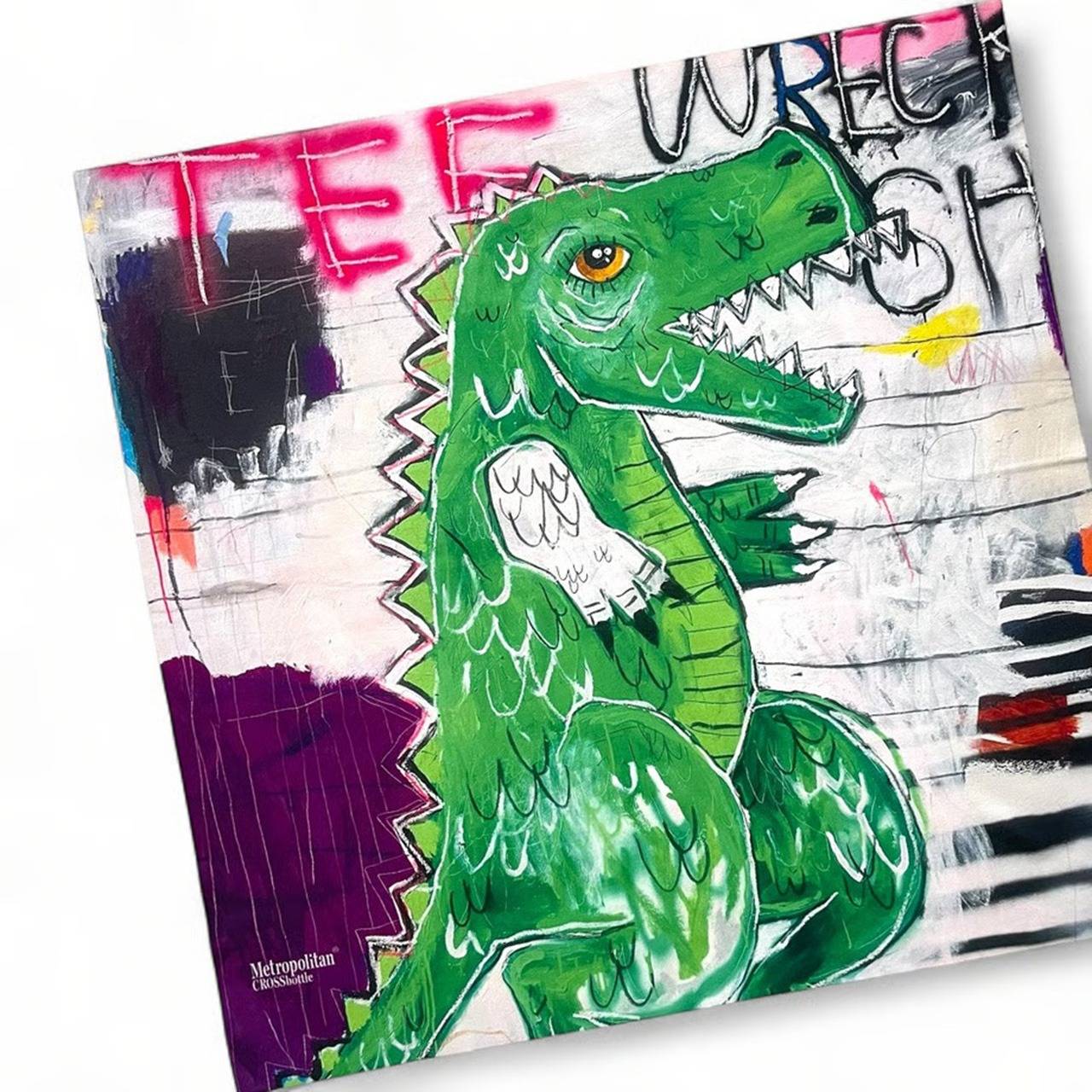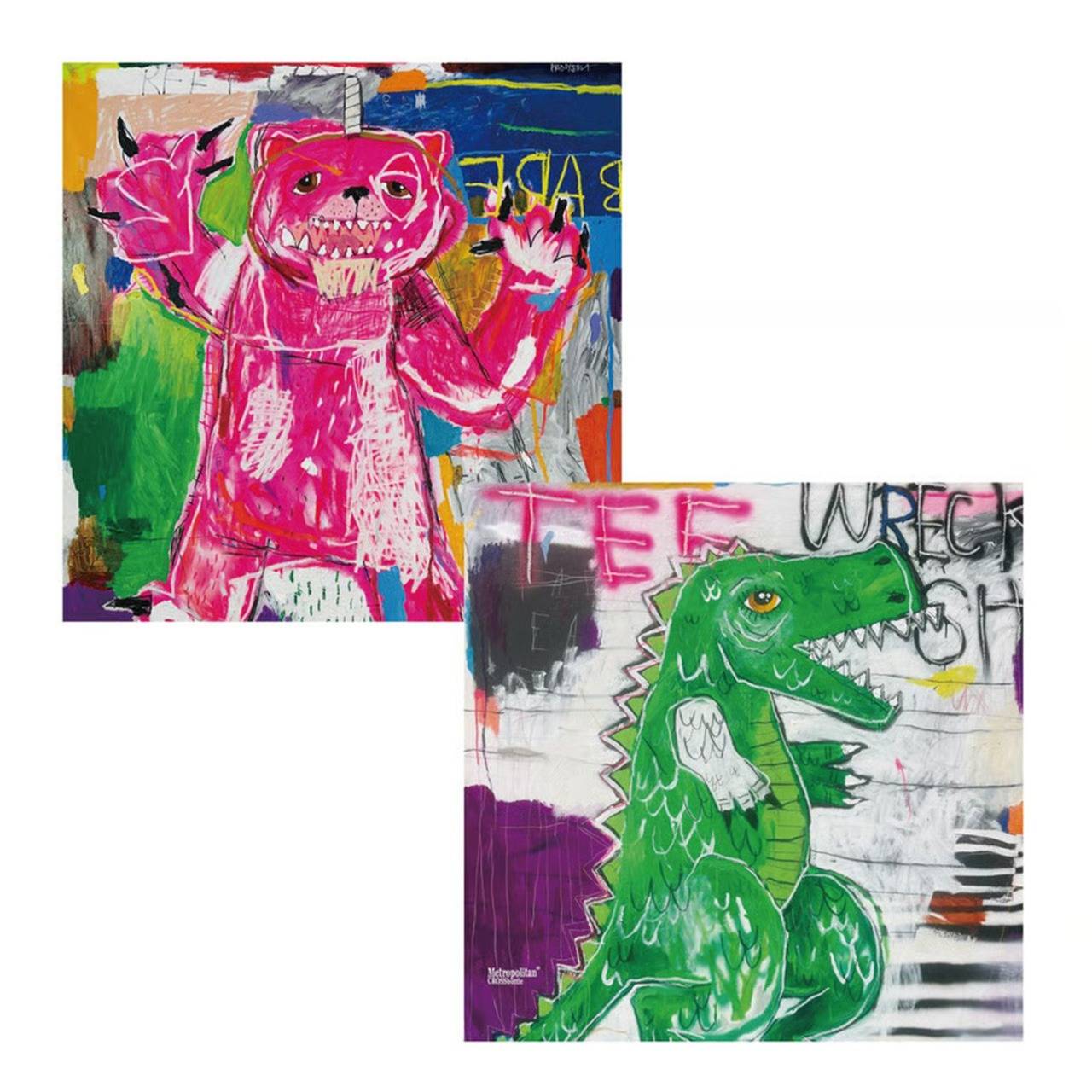 もう一つのデザイン、“ぶち壊せ”を意味する《WRECK IT》には、ネイサンの作品に頻繁に登場する「クマ」と「恐竜」が描かれている。