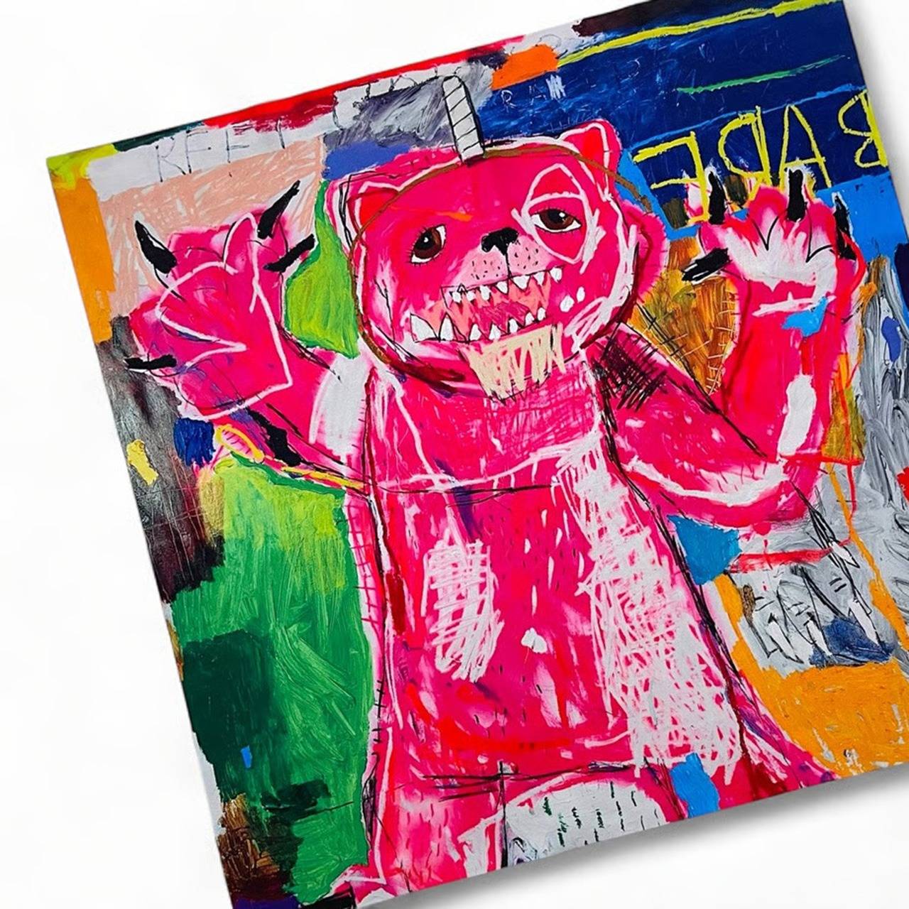 アクリル、スプレー、木炭、オイルスティック……手に取ることができるあらゆる画材を使い、身体全体を使ってキャンバスに感情をぶつける。独自に築き上げたそのスタイルは、かつてのジャン=ミシェル・バスキアを彷彿とさせながらも、より原始的で、どこか子どものような無垢さを湛えている。