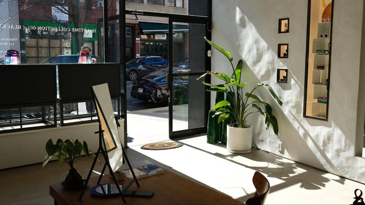 この店のオーナー夫妻は、フランスの名門アイウェアブランド「アン・バレンタイン」の家系を継ぐ、筋金入りの美学の持ち主である。店内には象徴的な「アン・バレンタイン・ブルー」が随所に配され、ニューヨークのど真ん中にいながらにして、フランスの凛とした空気感を感じさせる。単なるアイウェアショップではなく、一つの完成されたアートギャラリーのような品格を漂わせていると言ってもいいかもしれない。